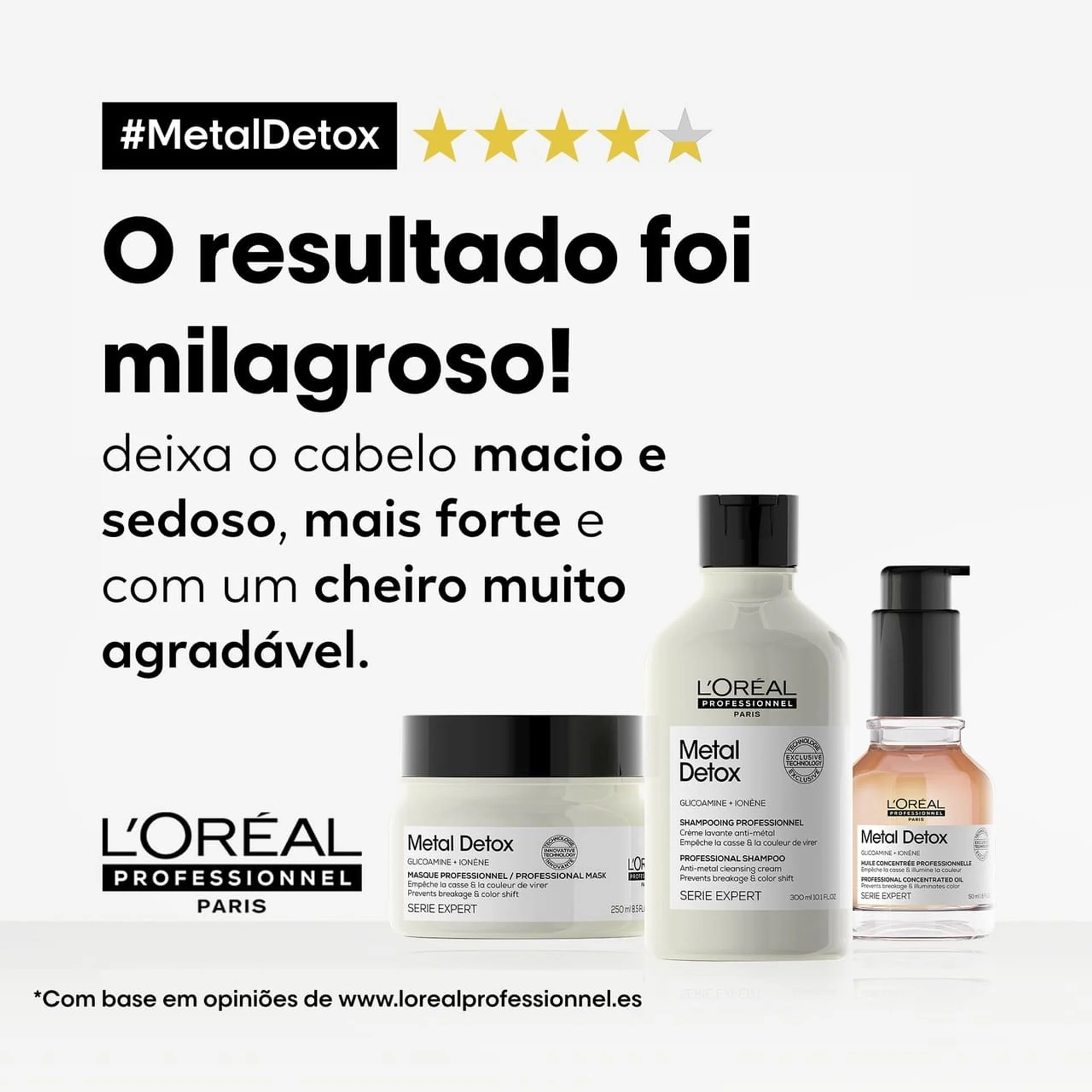 Concentrado com 10% de Glicoamina, uma molécula suficientemente pequena para rastrear e neutralizar o metal dentro da fibra, o pré-tratamento Metal Detox neutraliza o metal para proteger o cabelo antes dos serviços de coloração, equilíbrio ou aclaração.